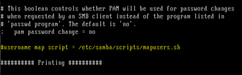We need to comment out the userman script so Metasploitable cannot use the exploit/multi/samba/usermap_script and run it to gain access to the victims machine. Granted, there was a patch released, but we can address it directly.